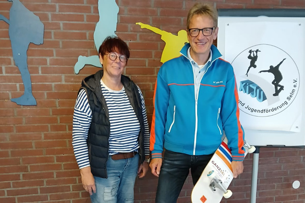 Der Wunsch wurde jetzt erfüllt: Christoph Krevert, 1. Vorsitzender der Kinder- und Jugendförderung Selm e.V. (KiJu) überreichte acht Skateboards, jeweils mit Helm und Schoner an GANZ SELM e.V.